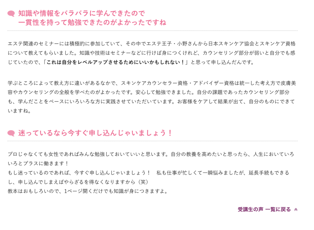 スキンケアアドバイザーの口コミを整理すると、知識が体系的に整理される、カウンセリング力が強化される、信頼性が高まり自信につながる、という変化が多く見られました。
